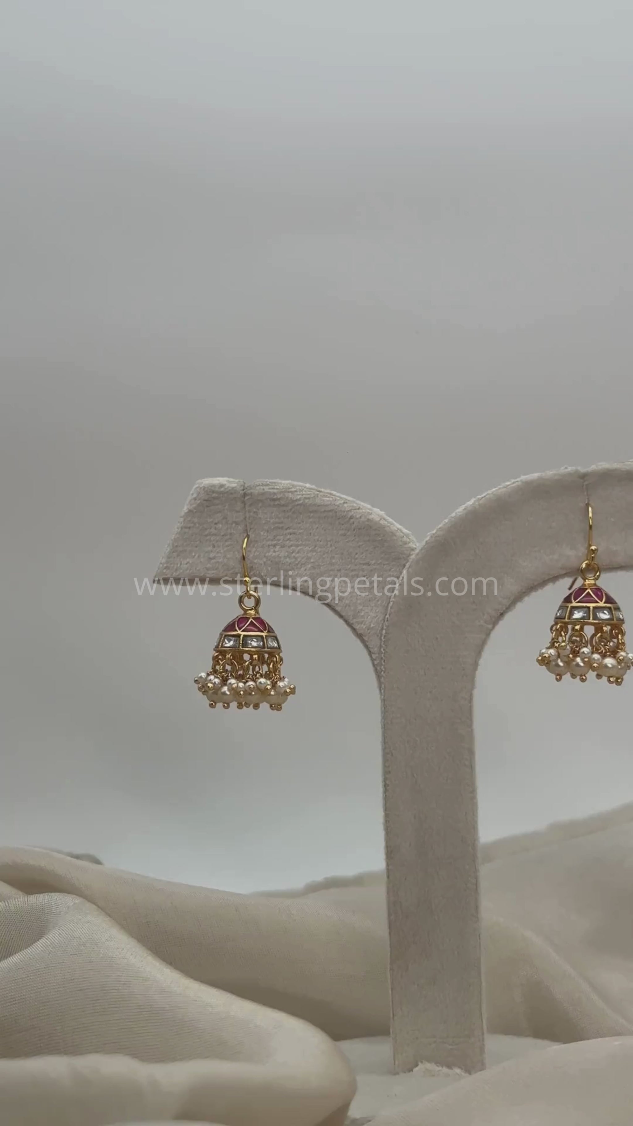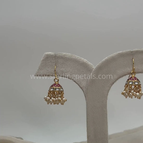 These stunning jhumkas feature a Ruby enamel dome with intricate gold accents and pearl bead tassels. The classic combination of Red and gold adds a regal charm, making them a must-have for festive and wedding ensembles.