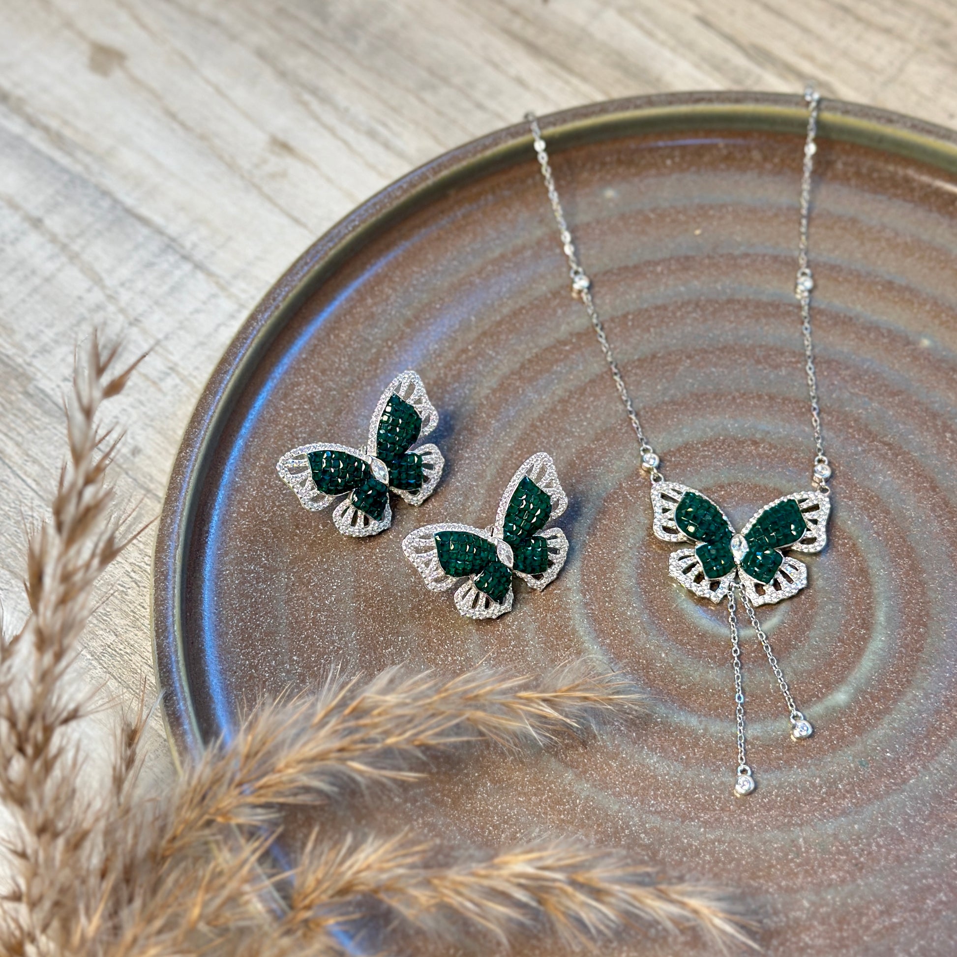 Sophisticated and bold, the Emerald Monarch Necklace Set features vibrant green butterfly wings outlined in crystal brilliance. A symbol of renewal and charm, this set brings a fresh burst of elegance to your wardrobe — ideal for cocktail nights and festive styling. only pendant with chain.