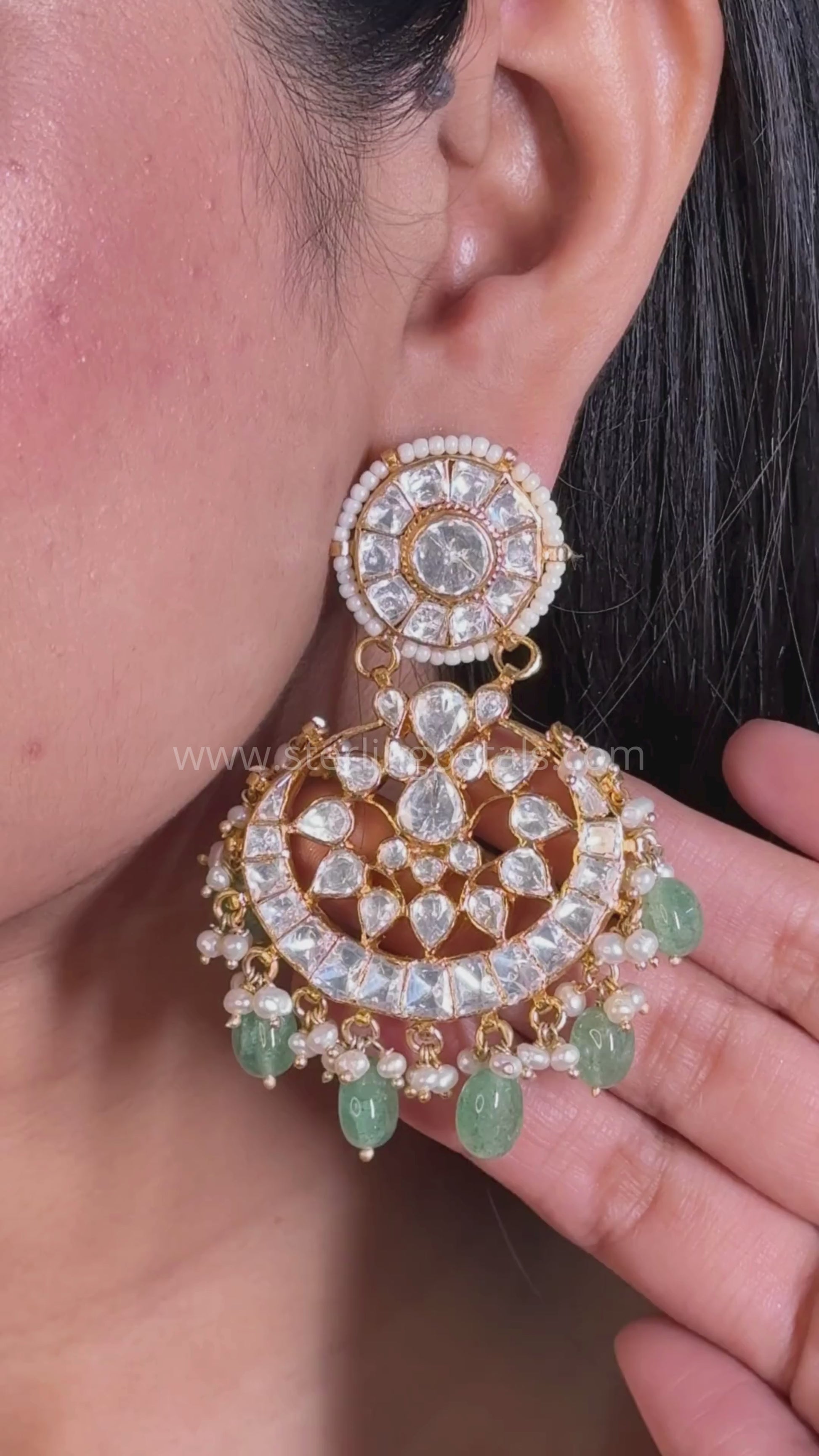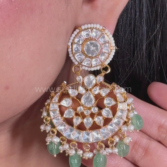 These opulent chandbali earrings blend classic Uncut work with dazzling white stones and lush emerald beads. Their crescent-shaped design, adorned with pearls and green drops, makes them a statement piece for grand occasions.