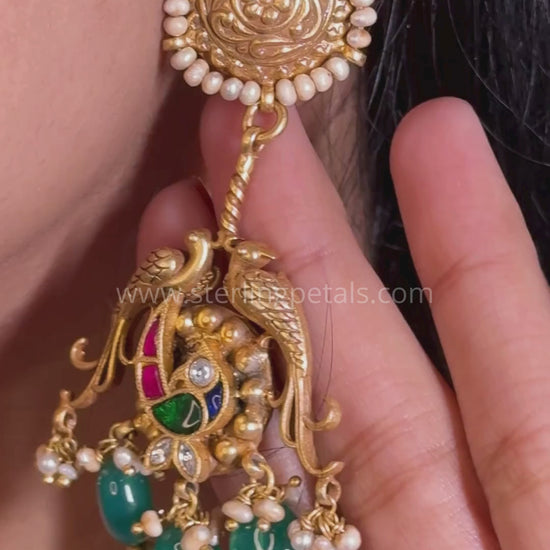 These mesmerizing Dangler feature an intricate peacock motif, delicately crafted with gold filigree work. The vibrant gemstones and pearl detailing enhance their regal charm, making them a perfect blend of tradition and luxury.
