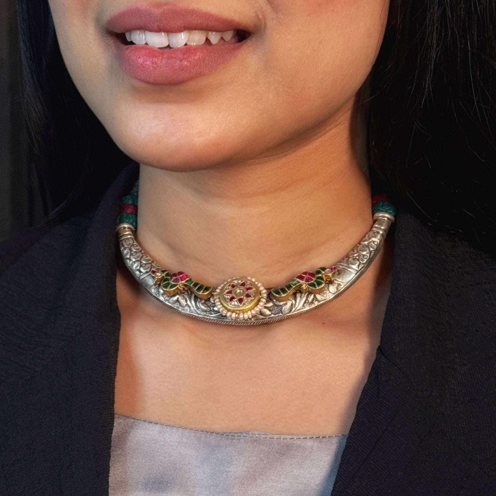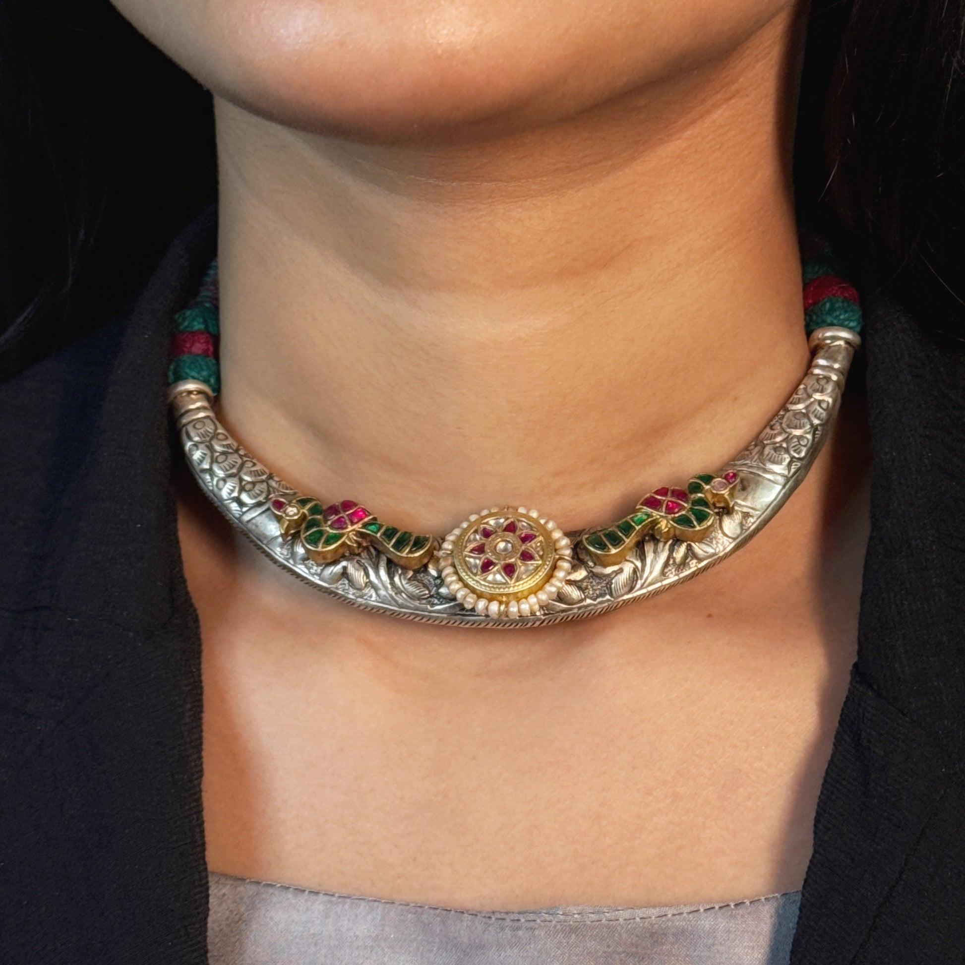 A bold, rustic choker featuring traditional hand-carved silverwork, accentuated with red and green enamel detailing. This piece offers a perfect blend of vintage and contemporary charm, making it a statement accessory for cultural and modern outfits alike.