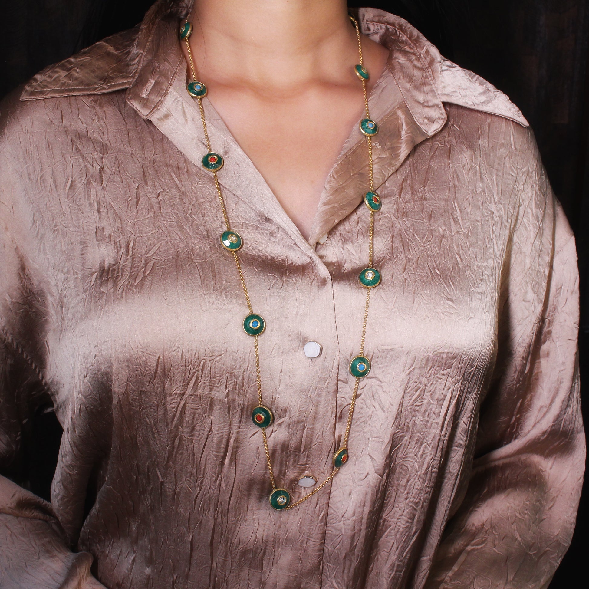 A timeless blend of tradition and elegance, this long necklace features round green enamel accents with intricate Kundan detailing. The lightweight chain drapes gracefully, making it a versatile piece for both casual and festive wear.