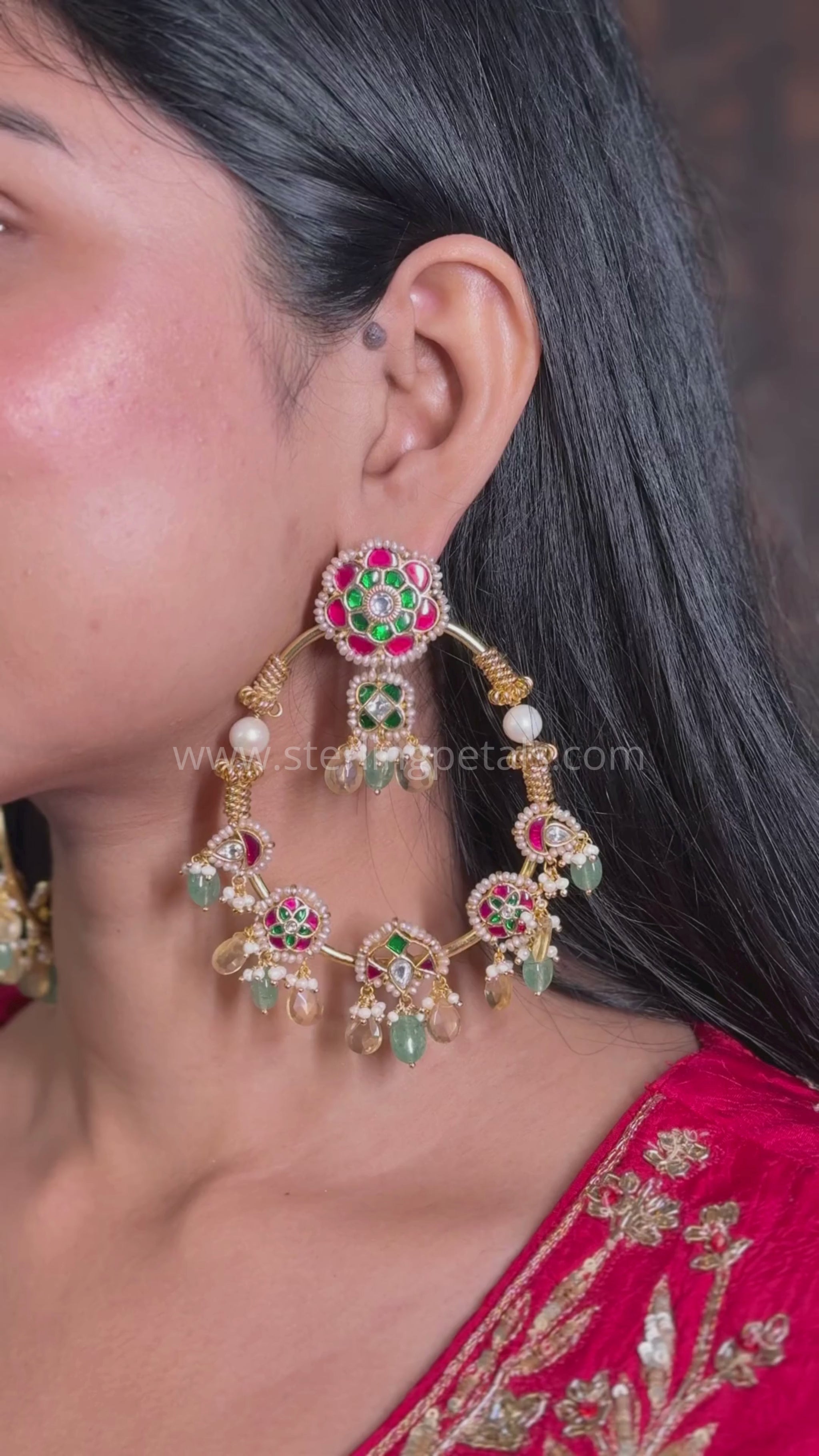 A stunning pair of traditional hoops with floral enamel tops and intricate gold wiring, these earrings are adorned with pearls, green and yellow beads, and miniature Kundan embellishments. A must-have for brides and cultural events.