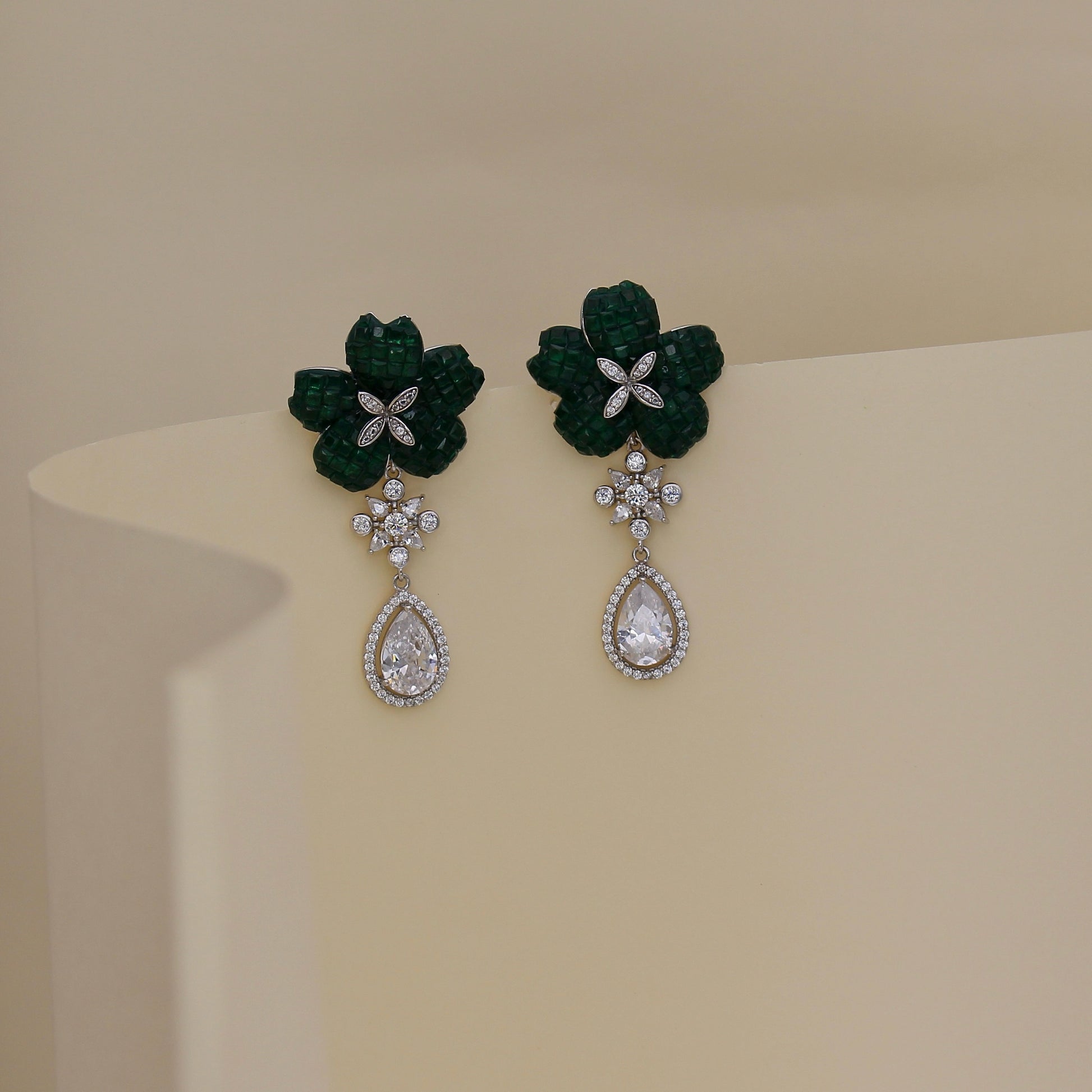 Channel garden elegance with these unique floral-inspired earrings. Deep green petals and sparkling white details form a lush botanical statement.