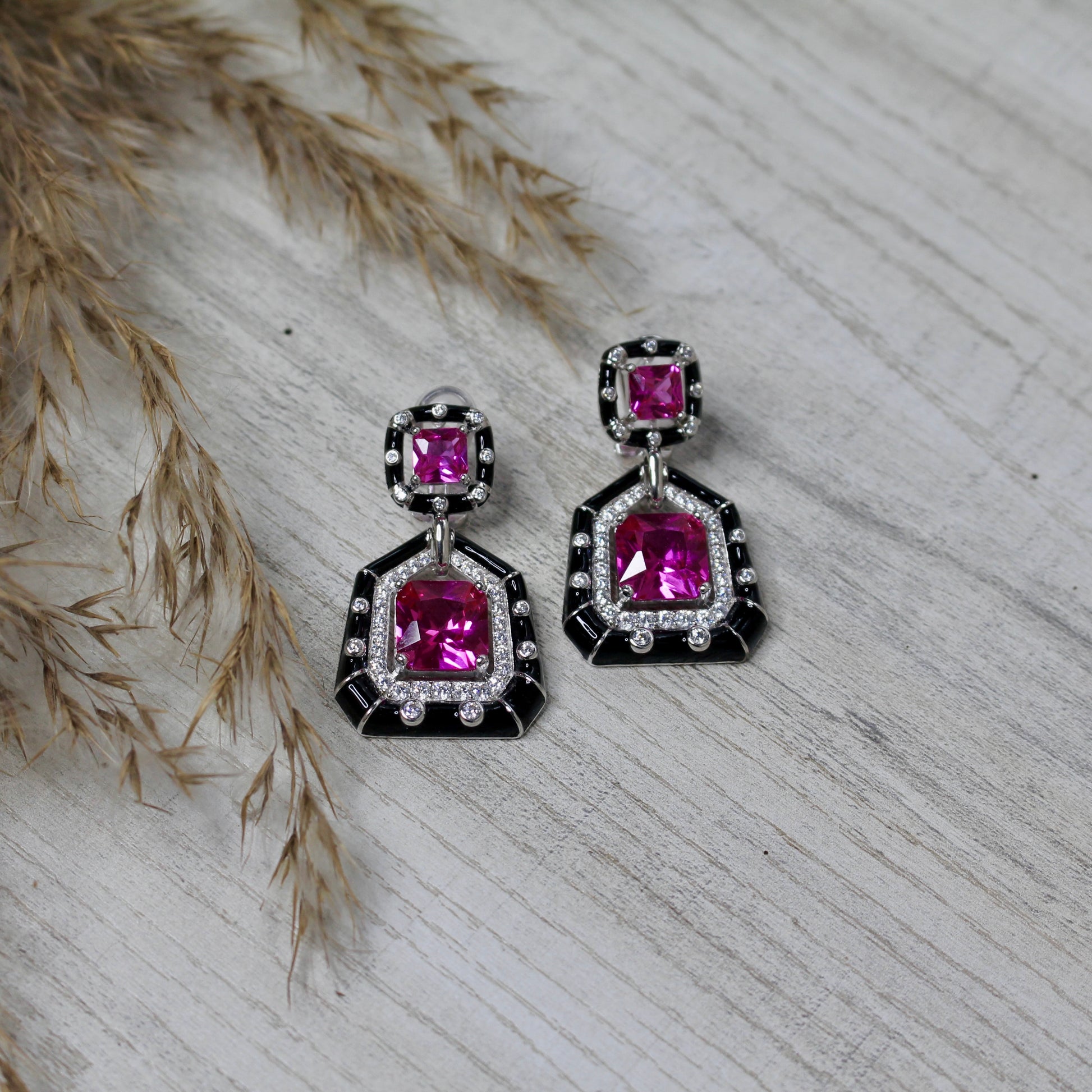 Vibrant fuchsia stones meet bold black enamel detailing in this art deco-inspired design. A statement piece that balances vintage flair with a playful twist.