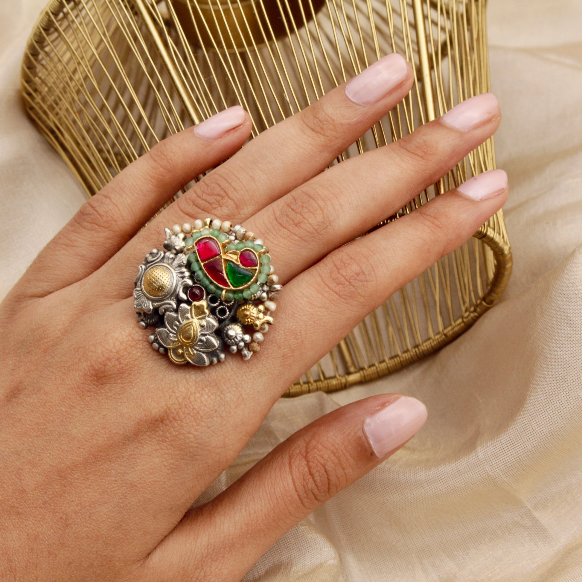 A true tribute to timeless artistry, the Mughal Mosaic Ring is inspired by heritage designs. Featuring a harmonious blend of oxidized silver, gold detailing, and vibrant gemstone inlays, this statement ring exudes an old-world charm. The floral and paisley-inspired motifs make it a must-have for those who appreciate intricate craftsmanship.