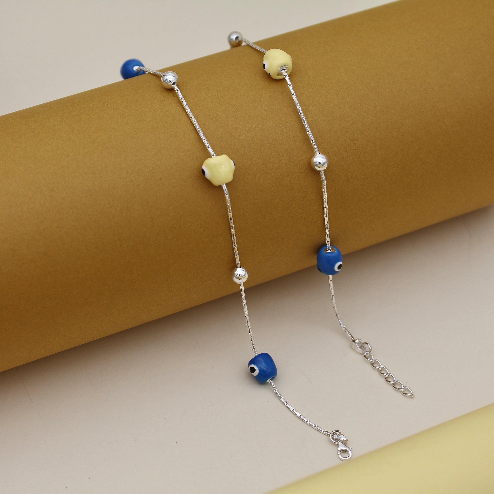 Make a splash with this lively anklet featuring colorful blue and yellow evil eye charms. It's bold, bright, and perfect for curious feet on the move. we are selling it single piece.