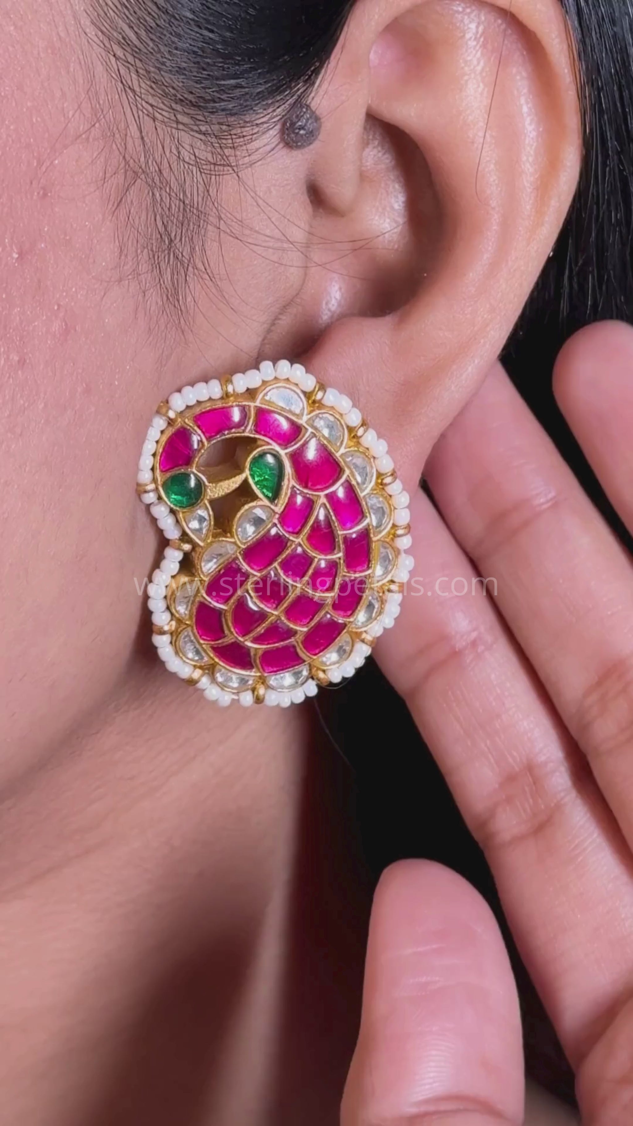 A fusion of contemporary and traditional design, these paisley-shaped studs are adorned with vivid pink , green and white Kundan stones, and pearl detailing. Their intricate latticework makes them a standout accessory.