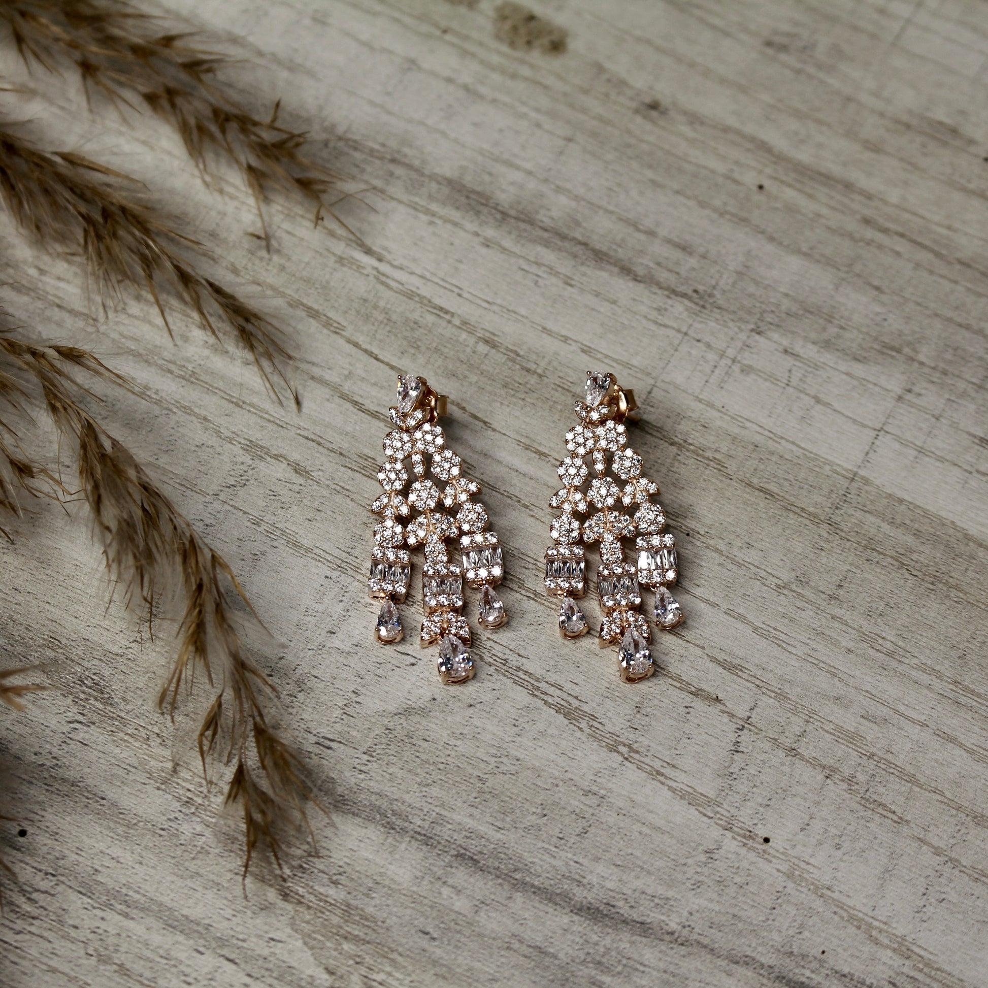 Drenched in brilliance, these chandelier-style earrings feature layers of intricately set crystals that shimmer with every move. The regal drop design exudes timeless elegance—perfect for grand occasions.