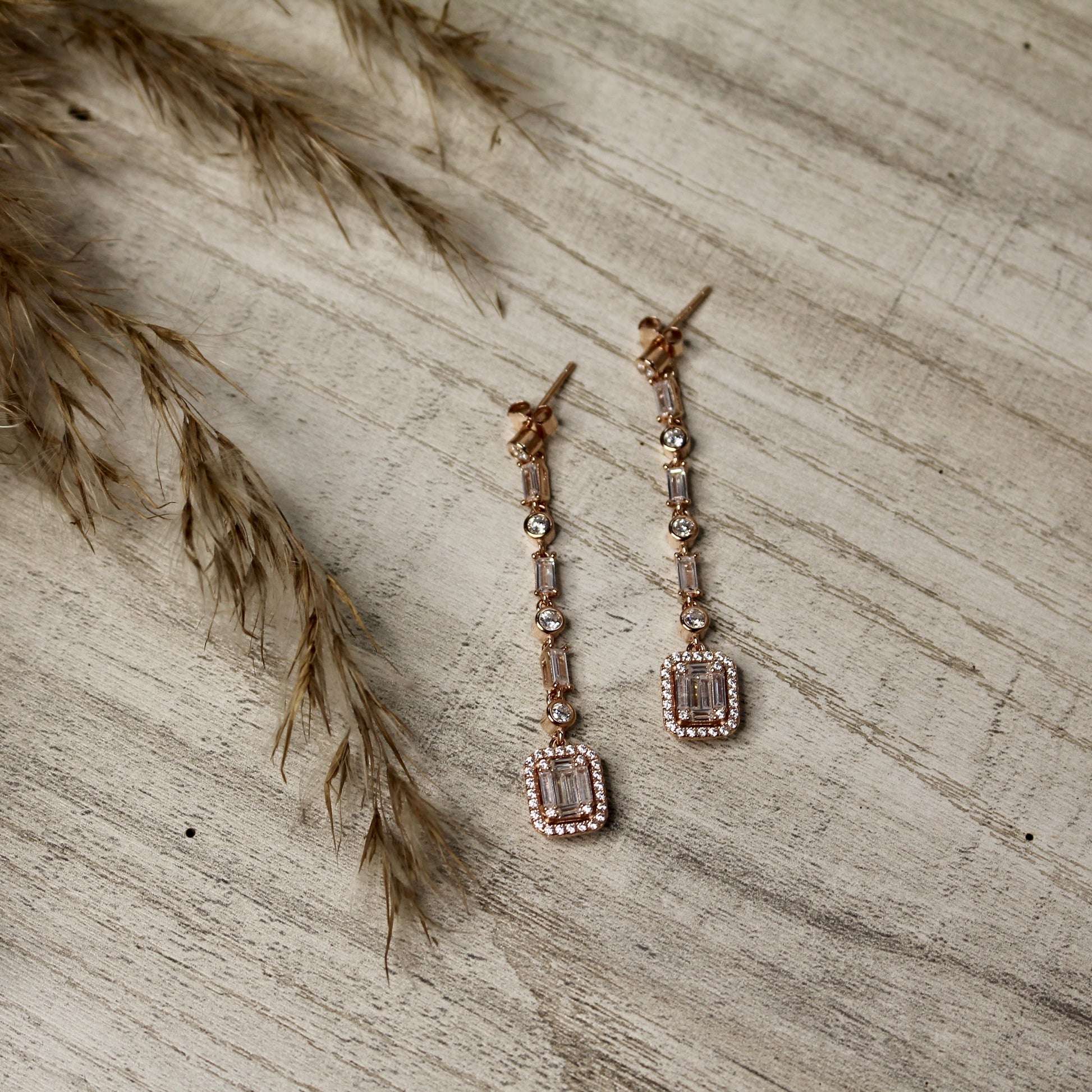 Sleek and minimal, these rose-toned danglers feature a line of baguette and round stones, ending in a glimmering emerald-cut charm. A modern essential with a delicate edge.