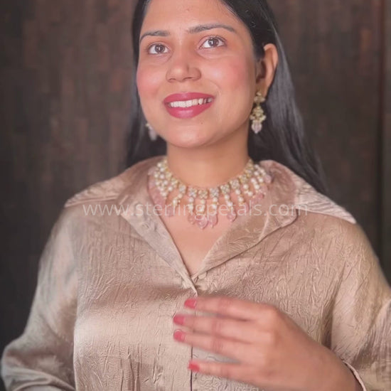 Soft, romantic, and feminine — this choker is adorned with rose quartz drops, pearls, and shimmering Kundan motifs. Its balanced design and matching earrings create an enchanting and graceful look for weddings, engagements, or evening soirées.