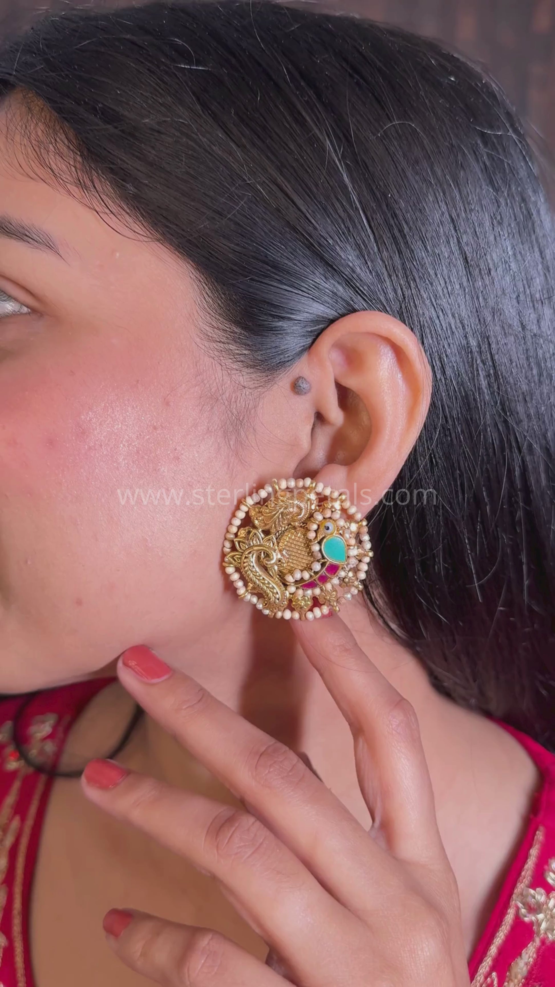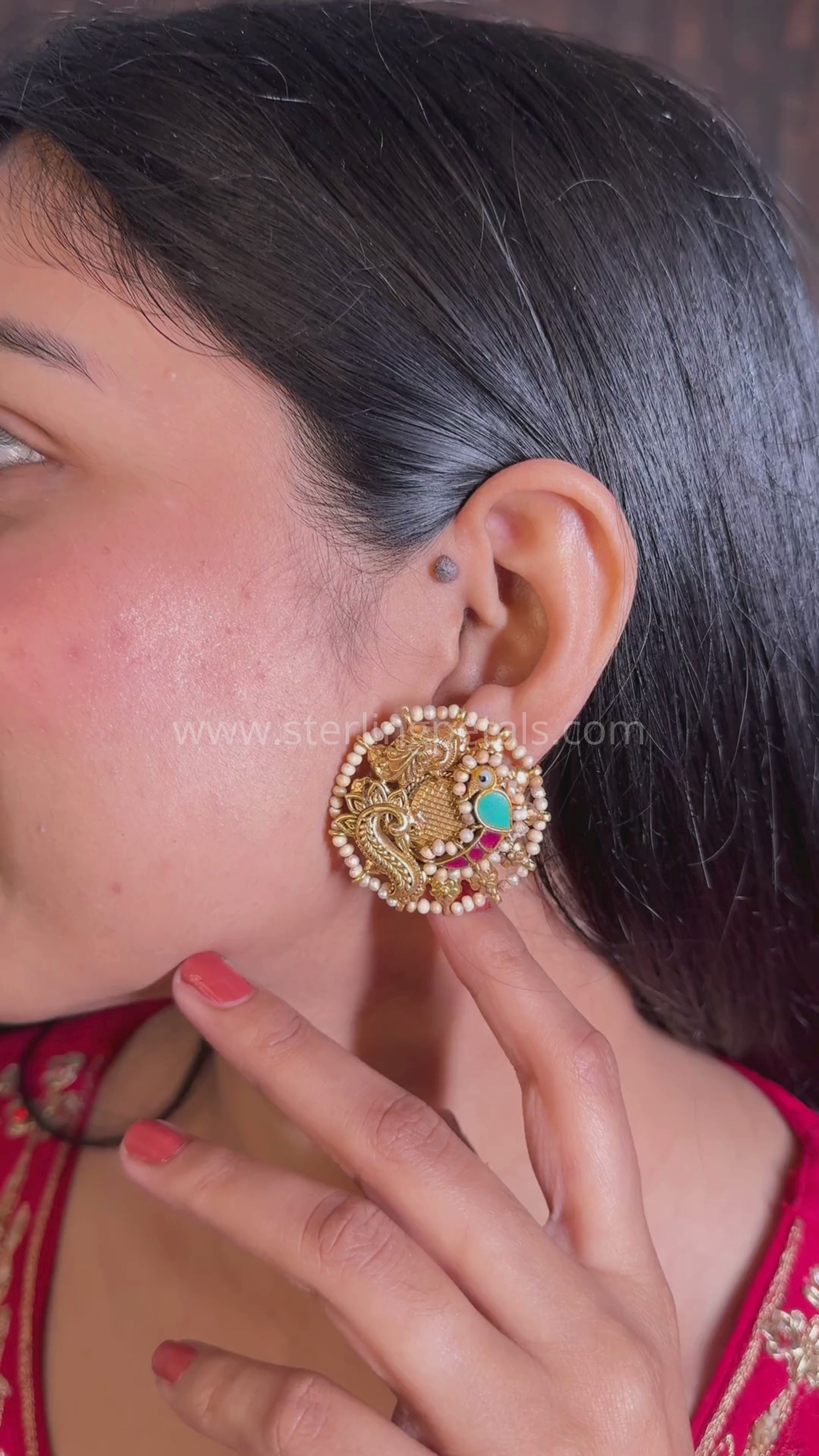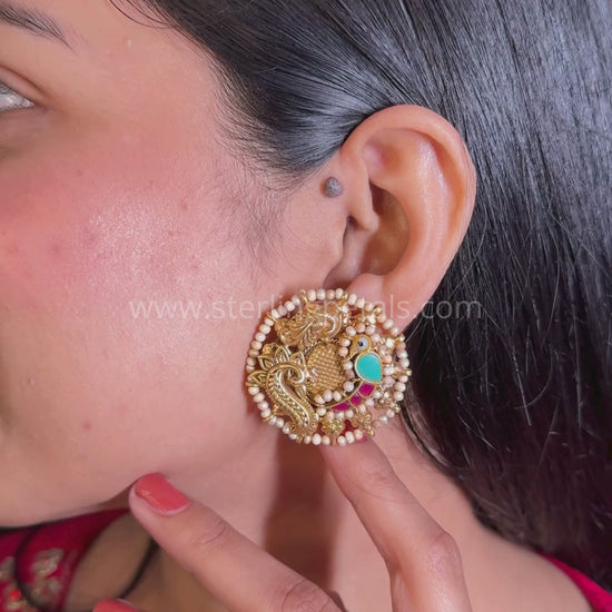 Inspired by heritage jewelry, these intricate round studs feature majestic peacock motifs in antique gold with vibrant turquoise and ruby enamel accents. The tiny pearls outlining the studs add to their vintage charm.