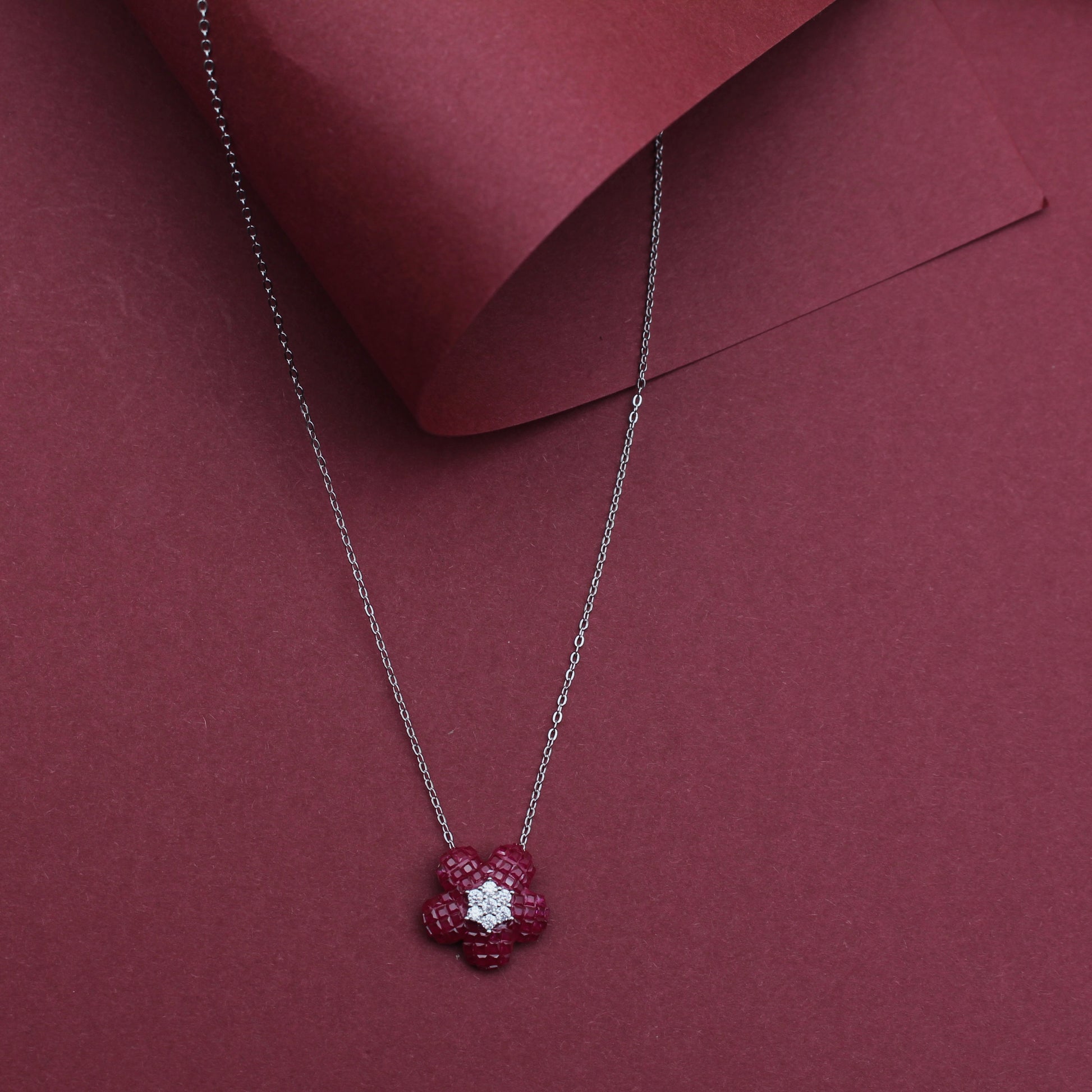 A playful and elegant necklace set featuring blooming floral motifs in radiant ruby hues, accentuated with shimmering cubic zirconia centers. Paired with matching floral studs, this set adds a youthful charm and subtle luxury to everyday or celebratory wear. complete set with pendant, chain and earrings.