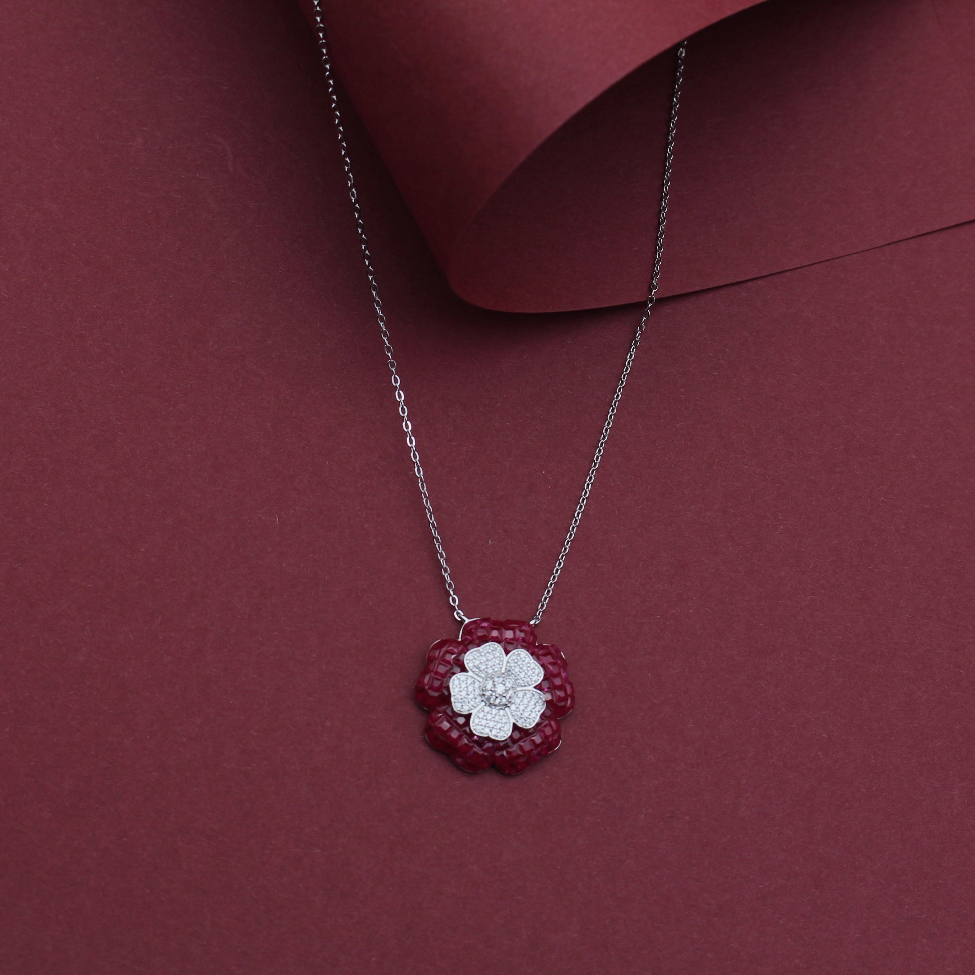 Inspired by spring showers and floral elegance, the Ruby Raindrop Blossom Necklace Set features pave-set flowers and vivid ruby raindrop earrings. The striking pendant mirrors the floral theme, making this set a refined yet bold choice for weddings and festivities. Only pendant with chain.